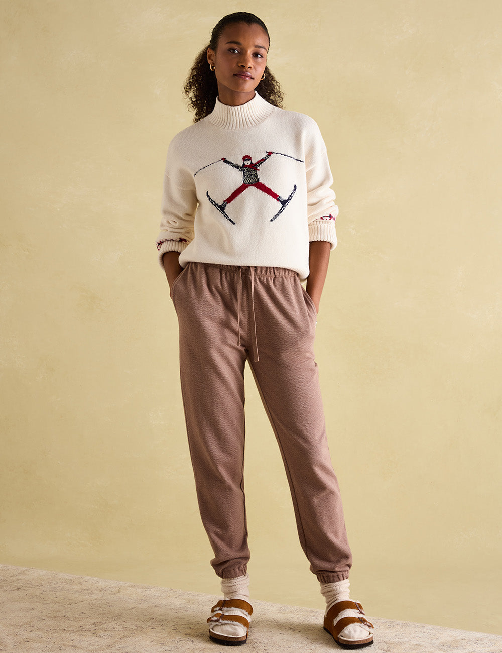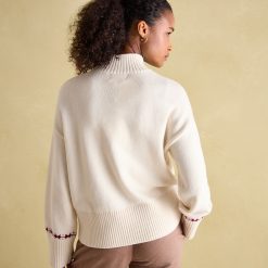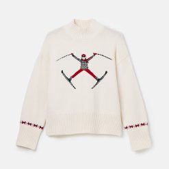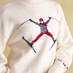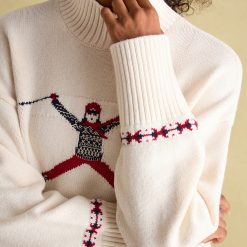 The Abigail Jumper offers a unique look with its vintage ski graphic intarsia and relaxed fit. Crafted from a cotton and wool blend, this stylish jumper offers comfort and warmth with its dropped shoulders, wide sleeves, and ribbed high neck. The deep ribbed hem and cuffs complete the look, making this the perfect winterwear choice.