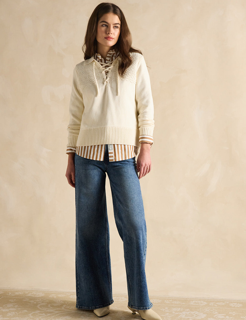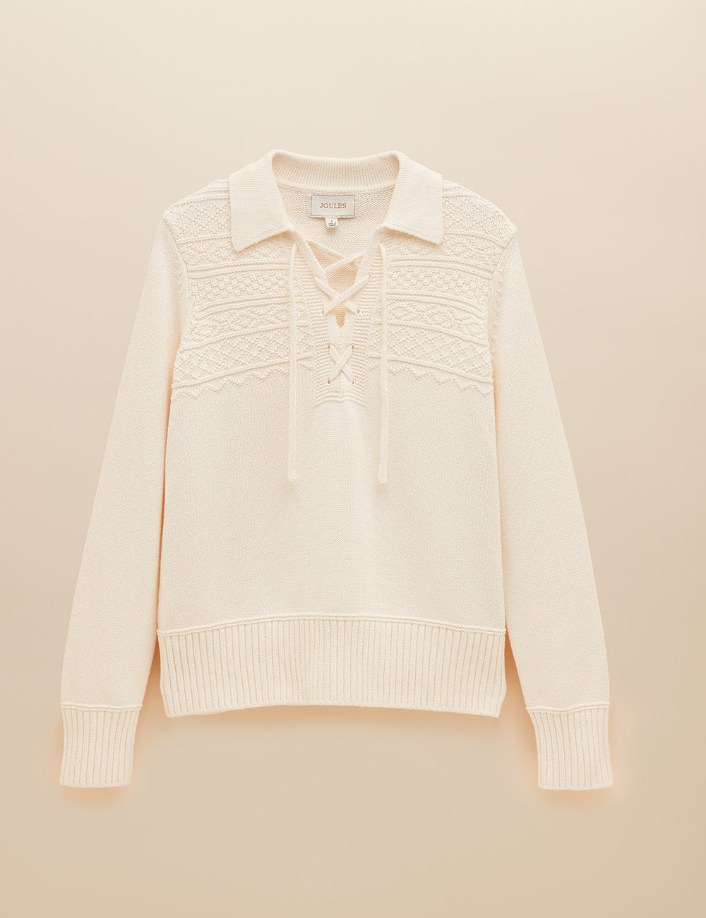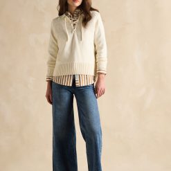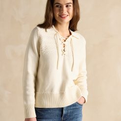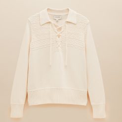 Designed for year-round wear, this versatile piece pairs effortlessly with your favourite jeans. Its textured knit detailing on the front yoke, collar, and lace-up neckline adds a stylish touch, while the deep ribbed hem and cuffs ensure a comfortable, flattering fit.