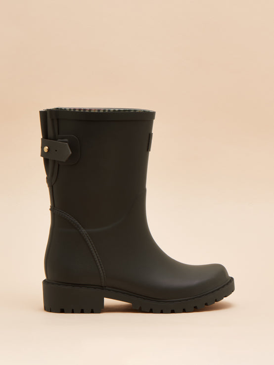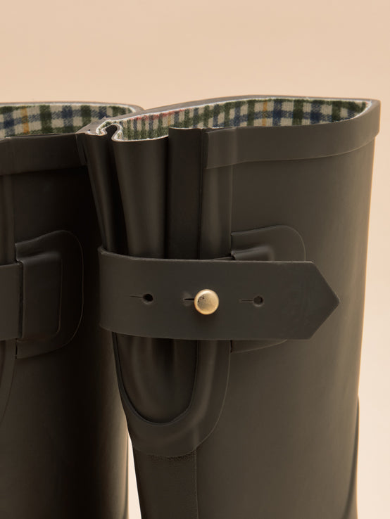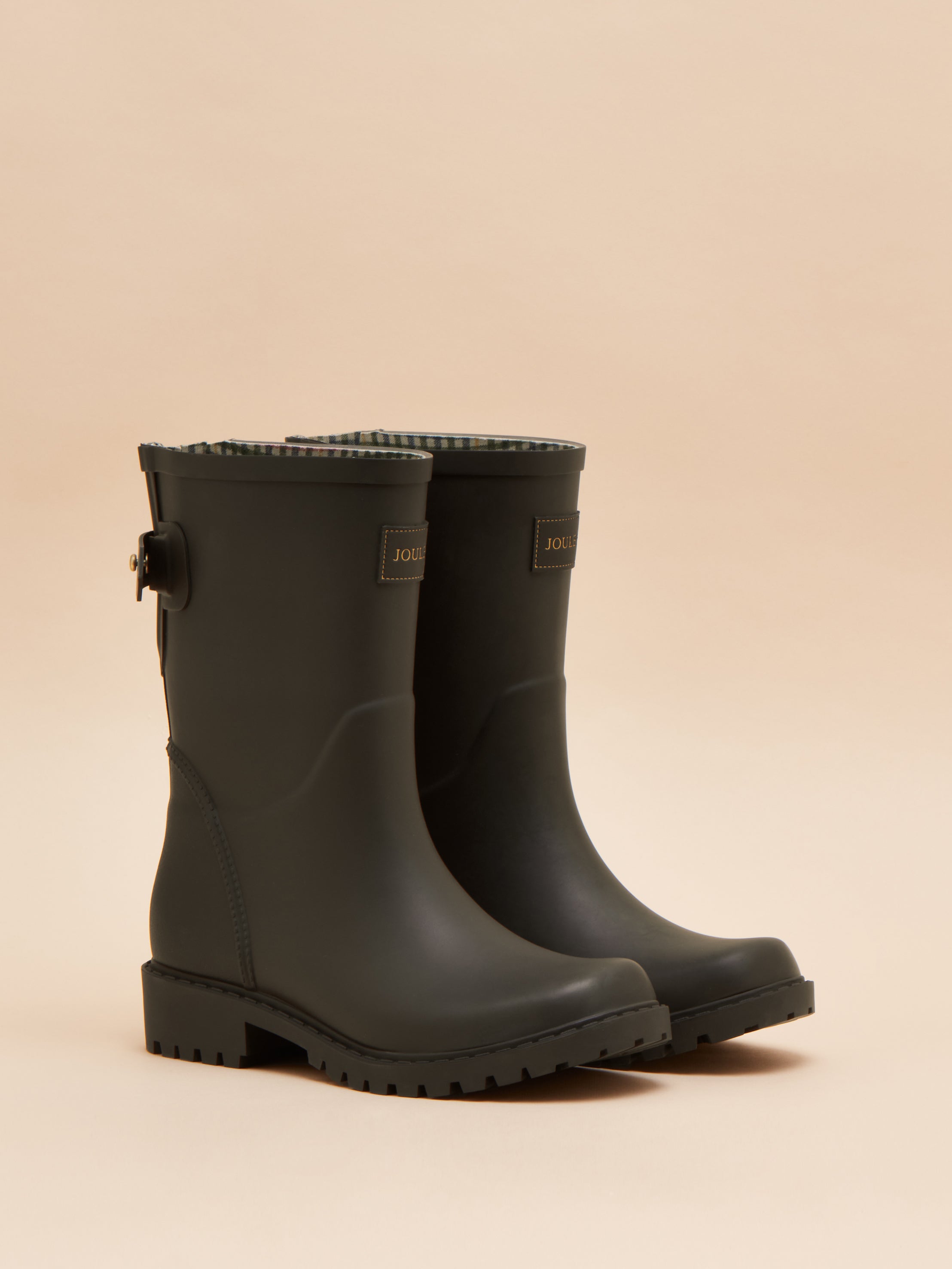Joules Wistow Adjustable Mid Calf Wellies Brown feature an adjustable elastic gusset for a tailored calf fit and water-dispersing outsoles for enhanced grip. For a heritage touch, the lining is finished with a traditional check, complemented by a branded leather badge on the front and a matte textured heel counter.